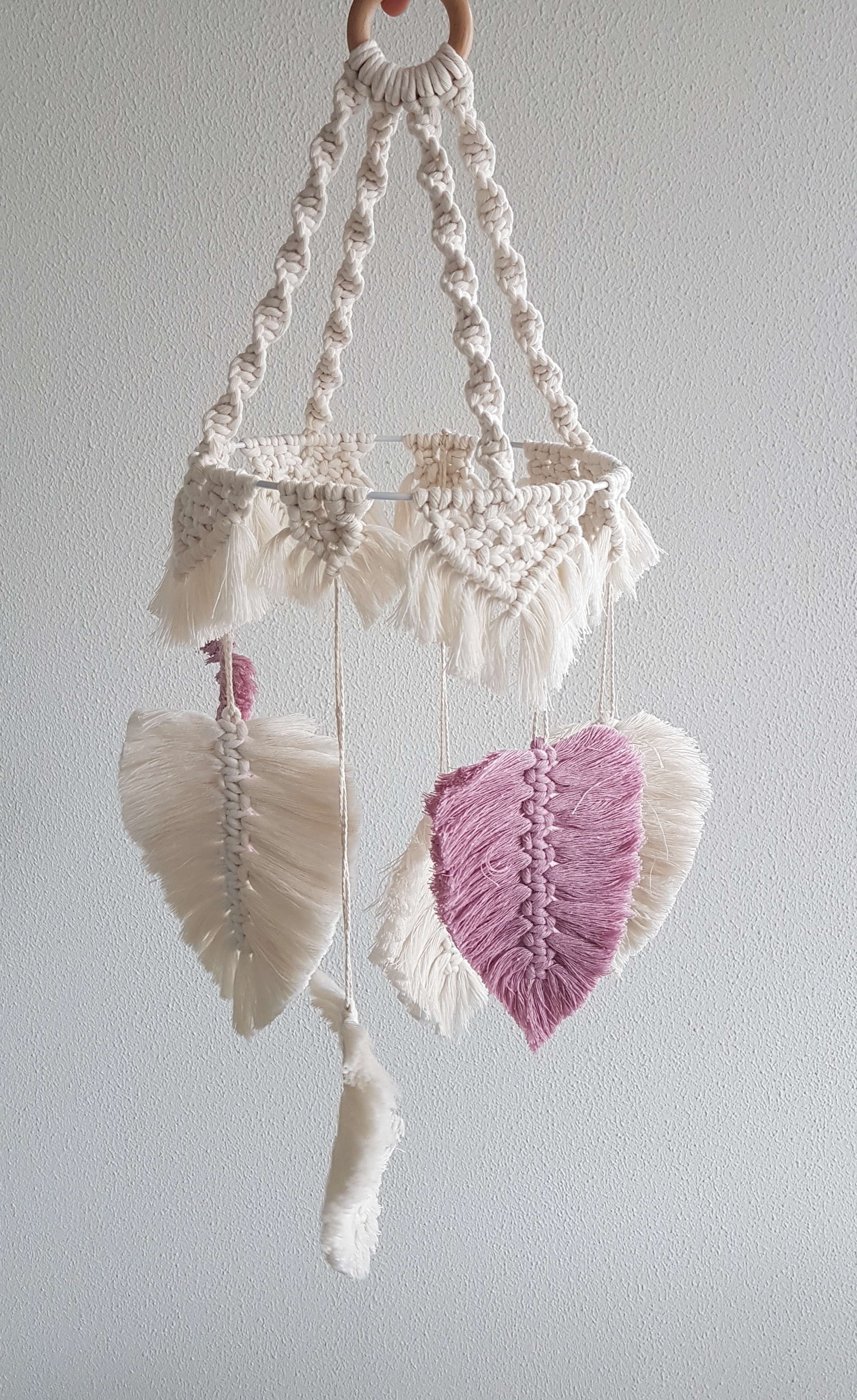 Mobile über ihrem Bettchen oder Wickelplatz baumelt - und möchten am liebsten nach den weichen Federn greifen! in aufwändiger handarbeit geknüpftes Baby Mobile aus 100% Baumwolle Makrammee Garn. Einzigartiges Mobile, da es sich, wegen der Handarbeit, die um ein Unikat handelt