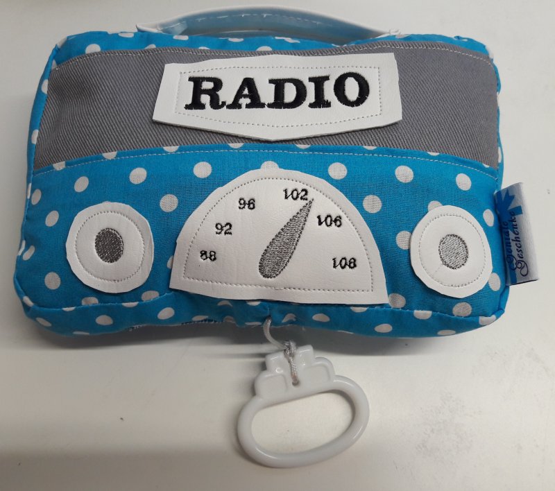 verwendete Materialien: Baumwollstoff, Kunstleder, Füllwatte, Spieluhr mit Kordel, Satinband