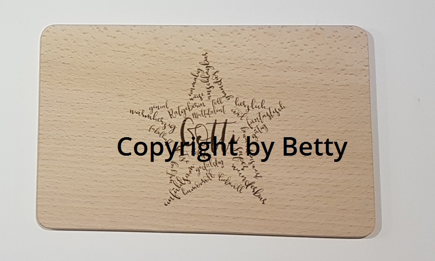 Die Gravur/Einbrennung erfolgt in der Mitte des Brettchens als Sternmuster wie auf dem Bild zu sehen. Wenn Sie anstatt 'Gotti' oder 'Mami' einen individuellen Namen wünschen, ist dies natürlich auch möglich. Wählen Sie dazu bitte bei 'Beschriftung' Ja an und teilen Sie im Feld Namen, den gewünschten Namen mit.