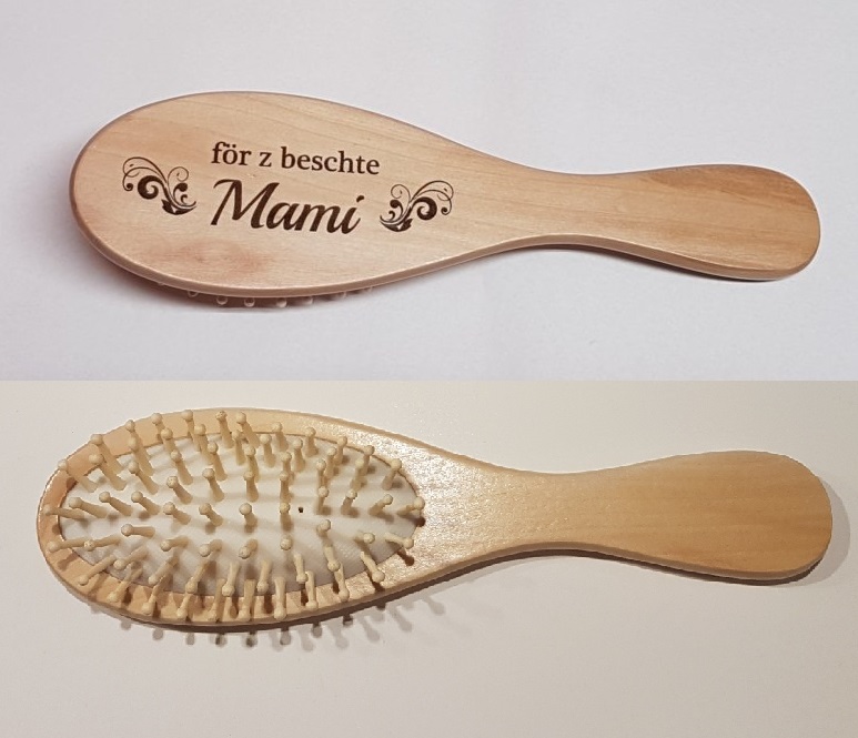 Die Gravur/Einbrennung erfolgt auf der Oberseite des Kamms. Auf dem Handgriff kann ein Name eingebrannt werden. (dazu bitte "Beschriftung - Ja" anwählen und bei 'Name' den Namen angeben)