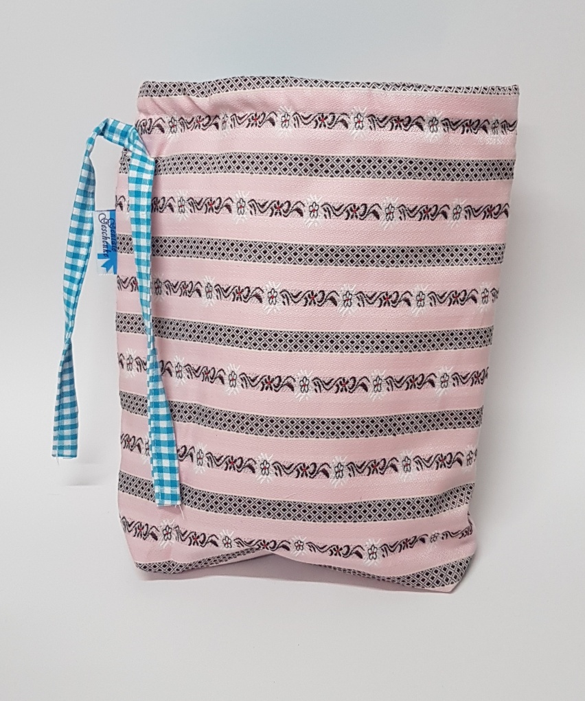 - 2 angenähte Bänder zum Verschliessen des Beutels
