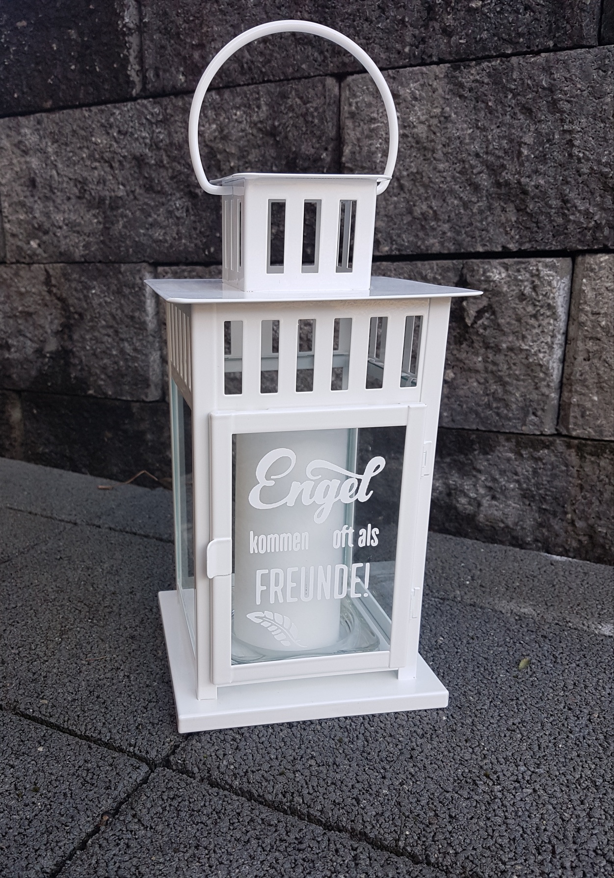 Lieferumfang: Laterne beschriftet an Vorderseite 'Engel kommen oft als Freunde' gemäss Bild